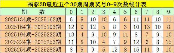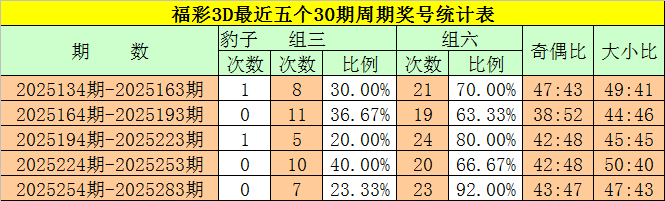 在最近一个30期周期内(第2025254期-第2025283期),豹子奖号莫得出现,组三奖号开出了7次,所占比例为28%,组六奖号共出现23期,开出比例为92%,组六号码轮空1期,本期重心关怀组六号码出现。