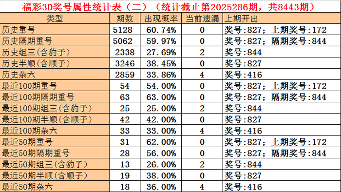 福彩3D第2025284期奖号为844,第2025286期奖号为827,隔期奖号出号8。从统计表等分析,最近100期隔期奖号出现63期,出现比例为63%,最近50期隔期奖号出现28期,出现比例为56%,最近10期隔期奖号出现 5期,出现比例为50%,本期防患隔期号中号码轮空。
